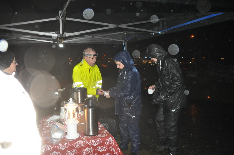 Tyvärr var det regnigt och blött och det märktes på deltagandet vid året Glöggatrôv. (Om man är skrockfull så var det fredag 13:e.). Men det var ändå 117 vuxna och 34 barn som trotsade vädret och gick den fina promenaden runt Stockasjöarna och där fick man lösa tipsfrågor och gåtor och tävla i en kastgren. Det serverades glögg, korv och kaffe. Naturligtvis var tomtarna där och delade ut godis till alla barn. Marschaller, facklor och lampor lyste upp stigen i vintermörkret.