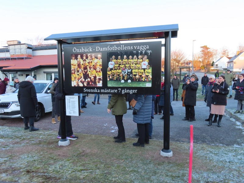 I söndags avtäckte Kerstin Johnsson, Kerstin Larsson, Anna-Greta Oscarsson och Maj-Britt Olsson skylten vid invigningen. Det var de som startade Öxabäcks Damlag 1966. Per Arvidsson (barnbarn till Doris och Jonas) och ordförande Göran Andersson höll i öppningsceremonin. Cirka 50 personer mötte upp. Efteråt gick de flesta med till Antikhuset där Hembygdsföreningen bjöd på fika med hjälp av Kerstins son Christian som skötte serveringen. Det blev en trevlig stund i Antikhusets café där ca 35 personer samlades.