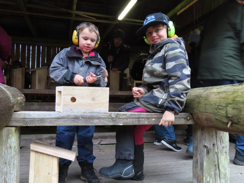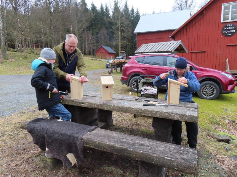 Det var 35 vuxna och barn som kom till Brokvarn för att bygga fågelholkar. På rasten vid 10-tiden bjöd föreningen på kaffe/te eller dricka med smörgås och kaka. 250 holkar färdigställdes innan kl 12.00.