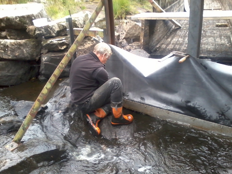 5 september – Håkan och Göran fixar gummidukar under dämmet. Blött och kallt, men även detta jobb ordnar sig.