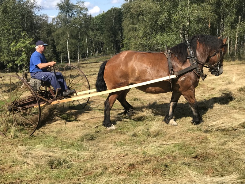 Bruno Elmelid med sin häst Lady hade tidigare i veckan varit vid torpet och kört ihop gräset med den gamla höräfsan.