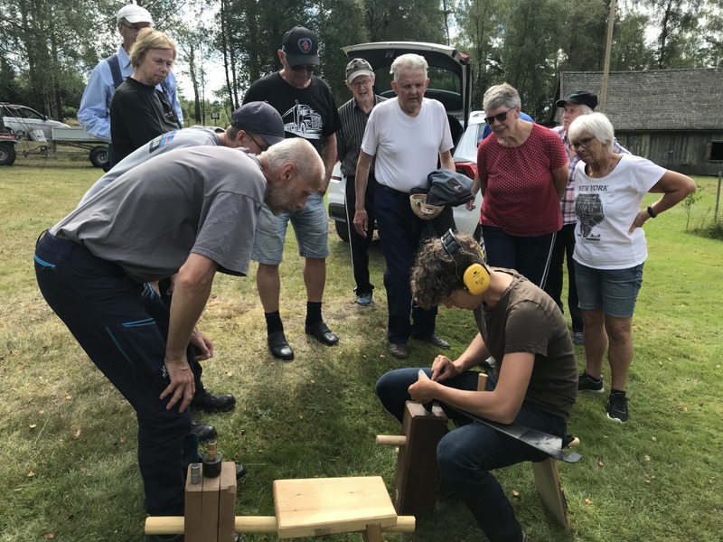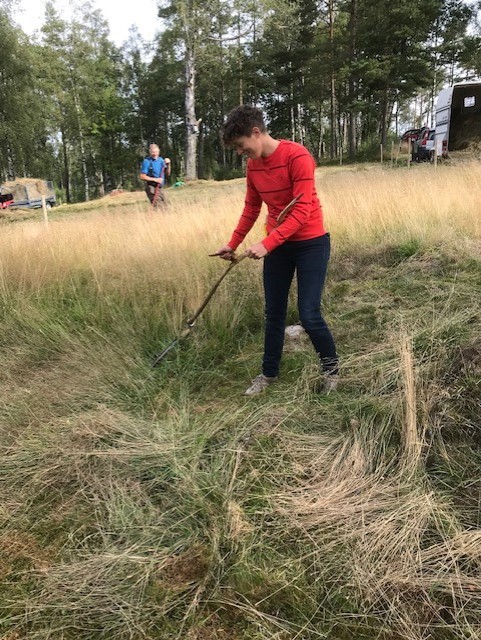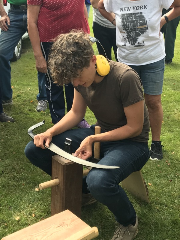Jenny från Ubbhult som är lie-expert visade hur man hanterar en lie och hur man gör den vass efter arbetet. Mycket intressant och några fick prova på att slå gräset efter hennes instruktioner.